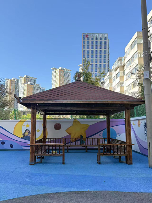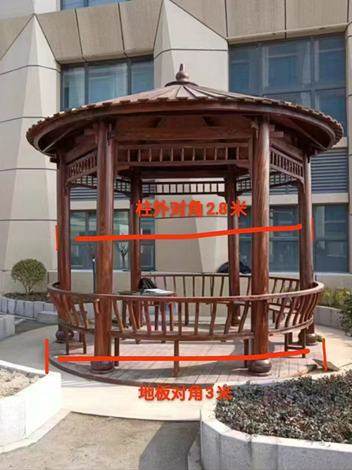 4、看款式尺寸。木凉亭大致分四角、六角、八角、双层、三层、异型等几种,建议消费者在购买时提前看好款式,量好具体尺寸,选好合适的款式,建议好打地基,因为常规的木凉亭的重量一般都有400多Kg,考虑到长期的接触受力是否会导致地面变形下陷,使木凉亭不平。